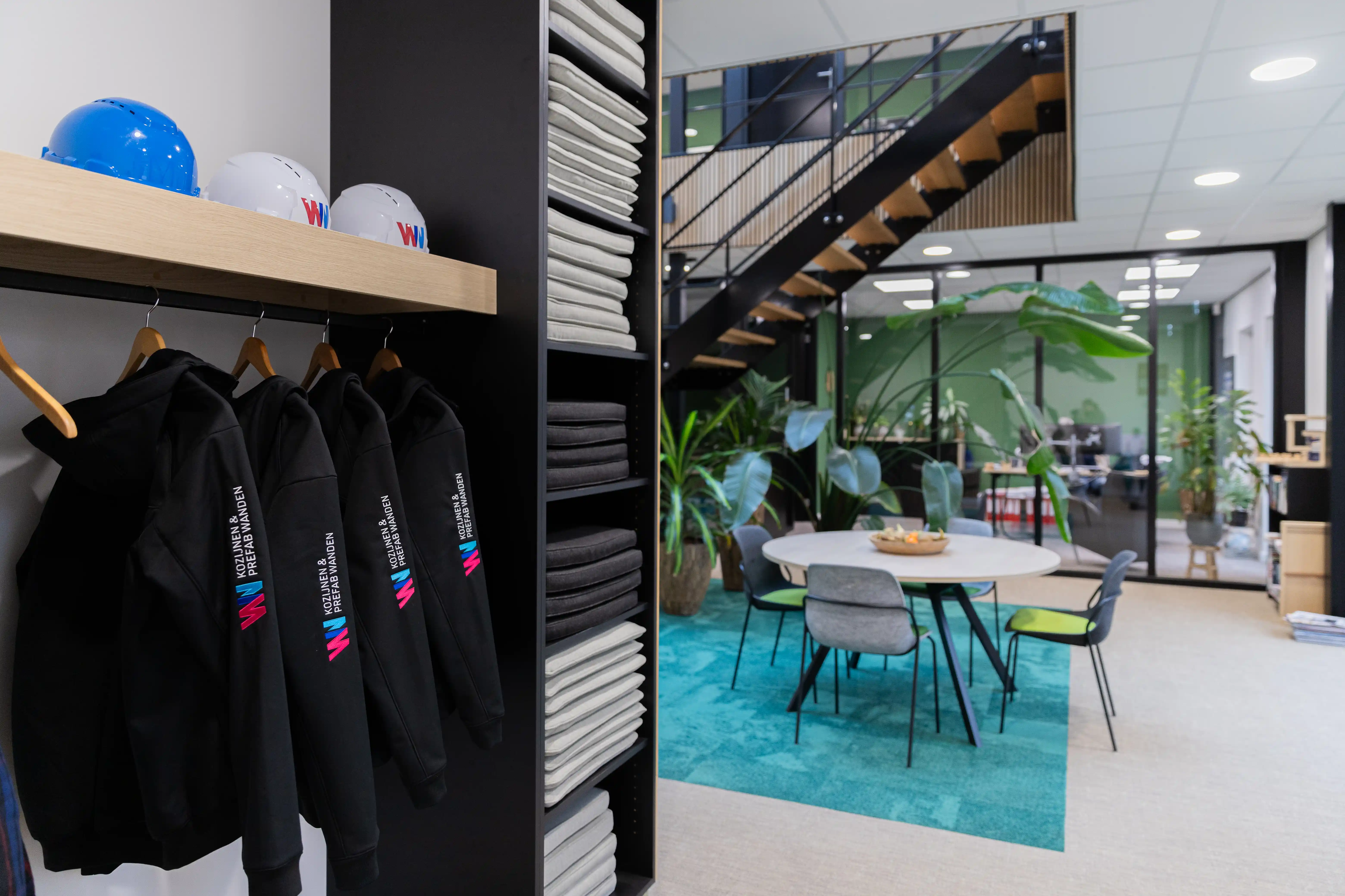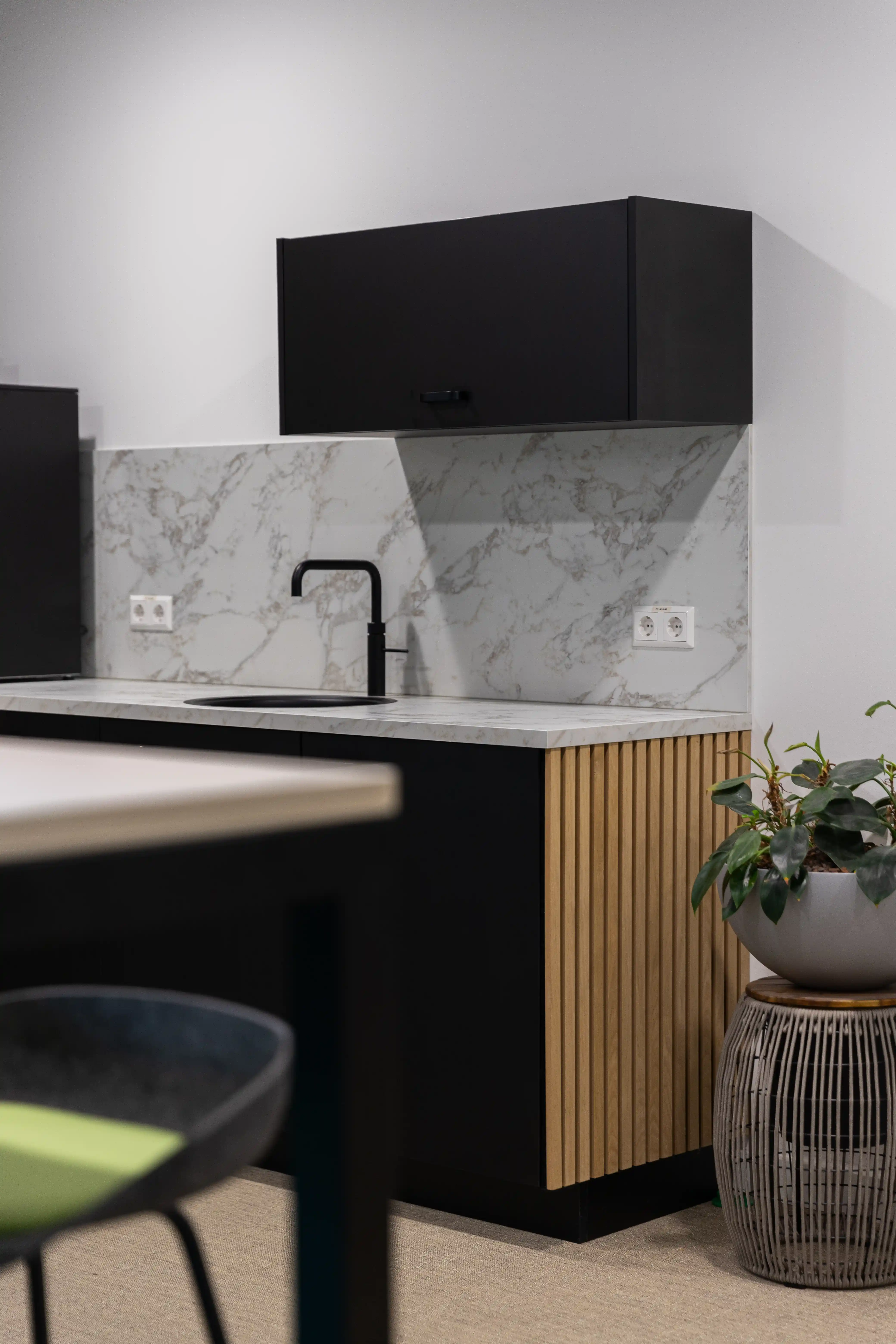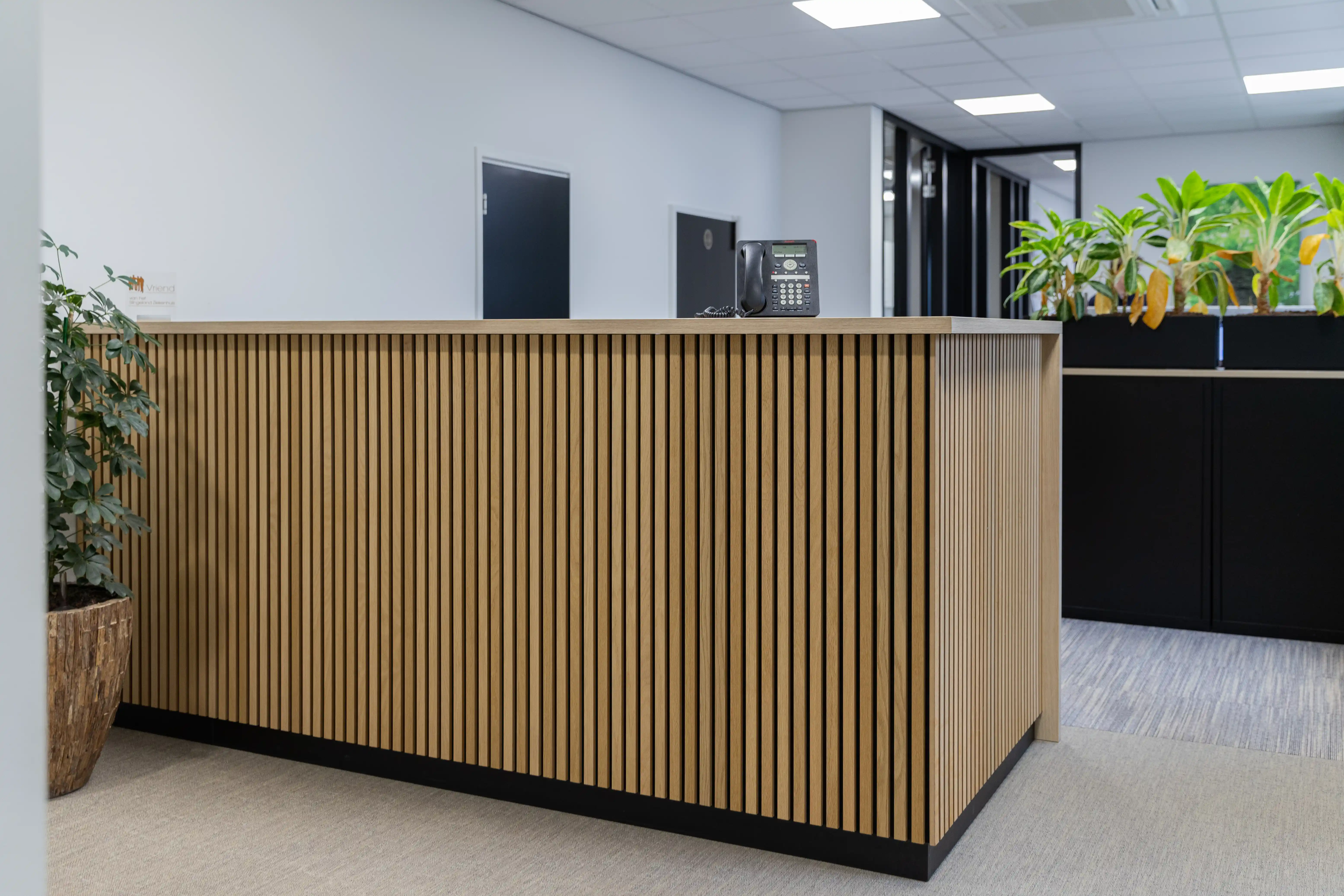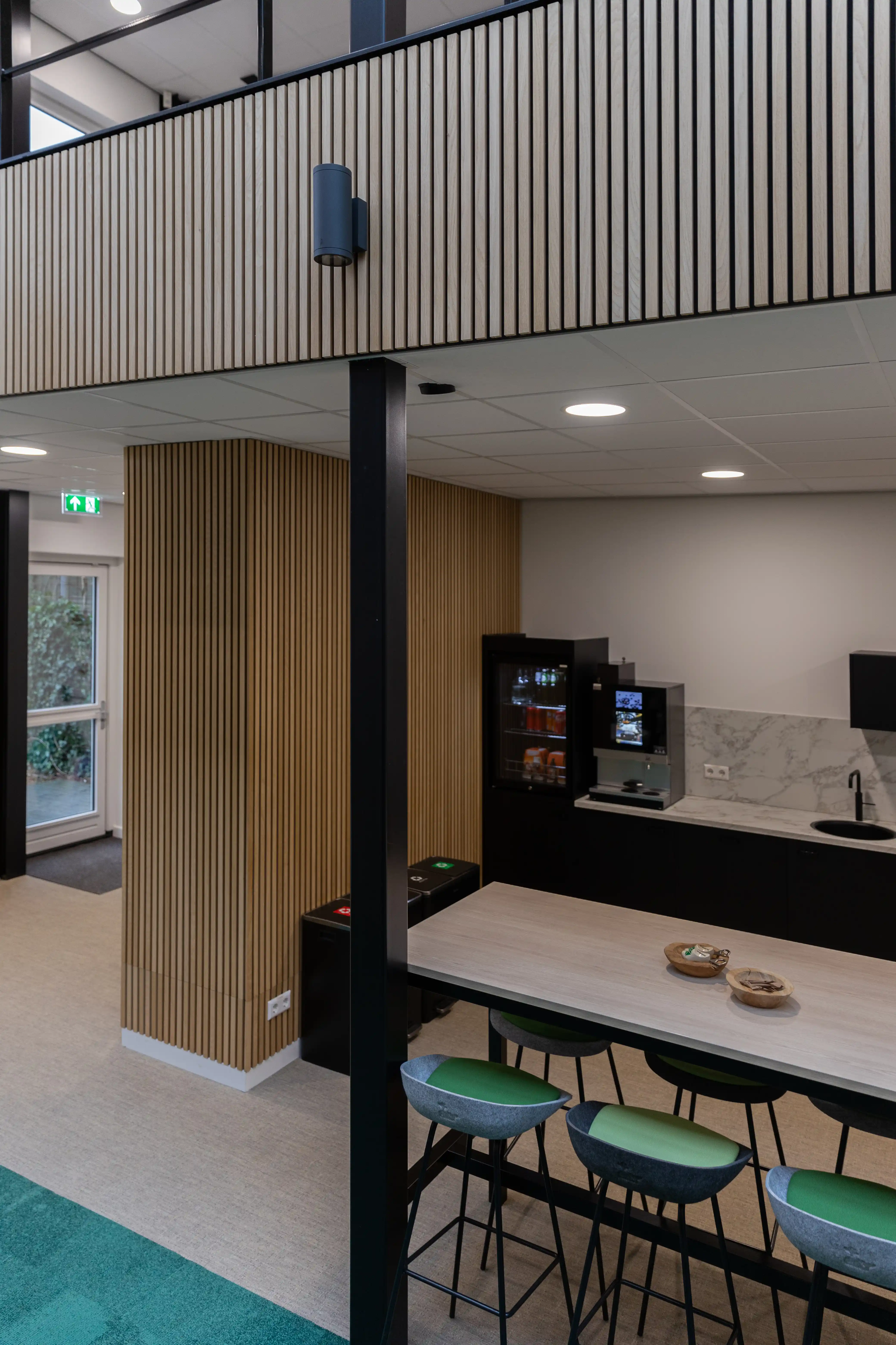 Voor dit kantoorproject realiseerden wij een complete maatwerkinrichting. Van een strakke receptiebalie tot een functionele pantryopstelling en een stijlvolle garderobe — elk onderdeel is met oog voor detail ontworpen en uitgevoerd. De wanden op de begane grond bij de entree, pantry, garderobe en kantine, evenals de balustrade op de eerste verdieping, zijn bekleed met WoodUp. Dit materiaal voegt warmte en natuurlijke textuur toe aan de ruimte, en zorgt voor een moderne en uitnodigende uitstraling. Een harmonieus geheel dat professionaliteit en sfeer perfect combineert.