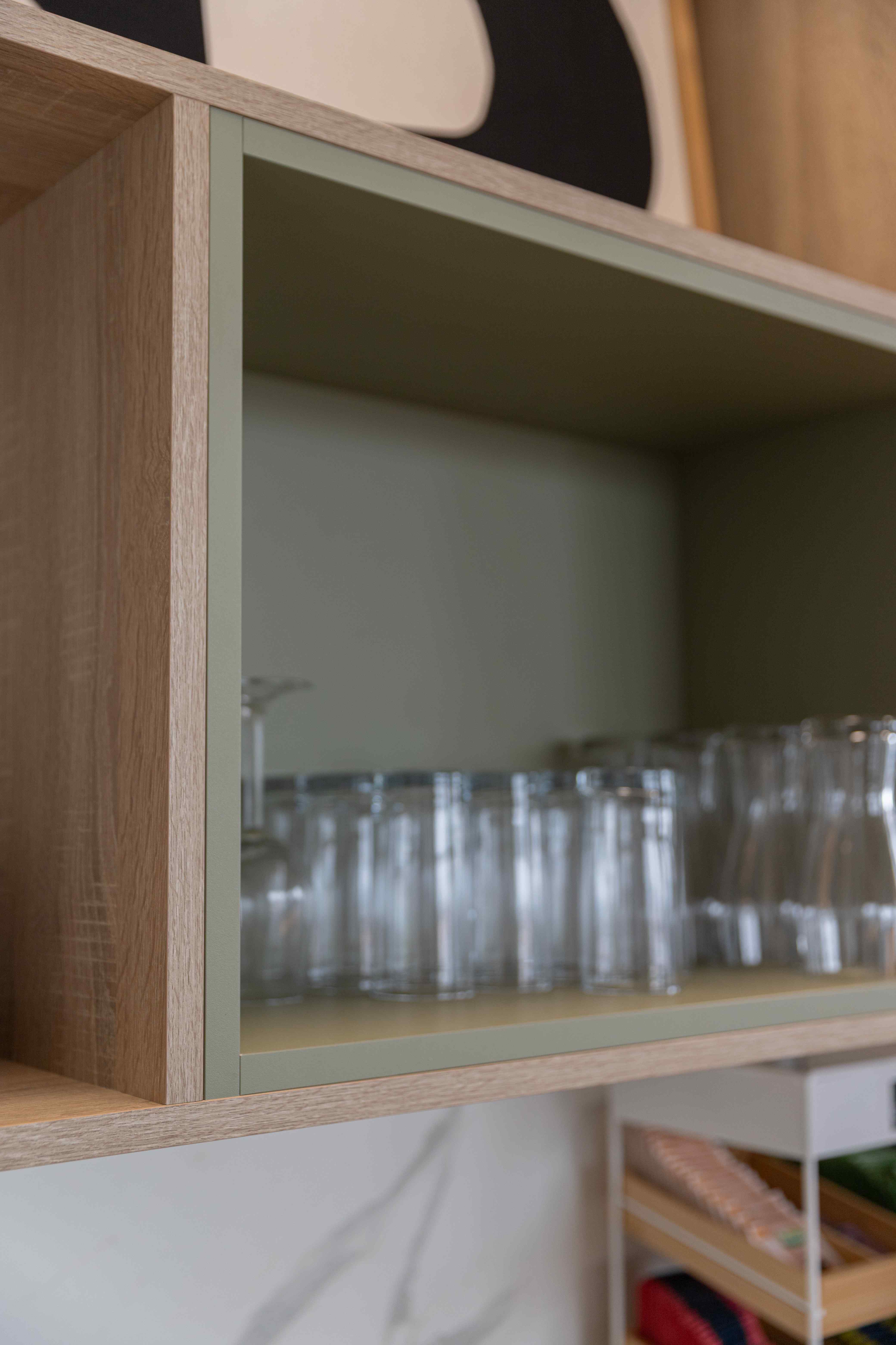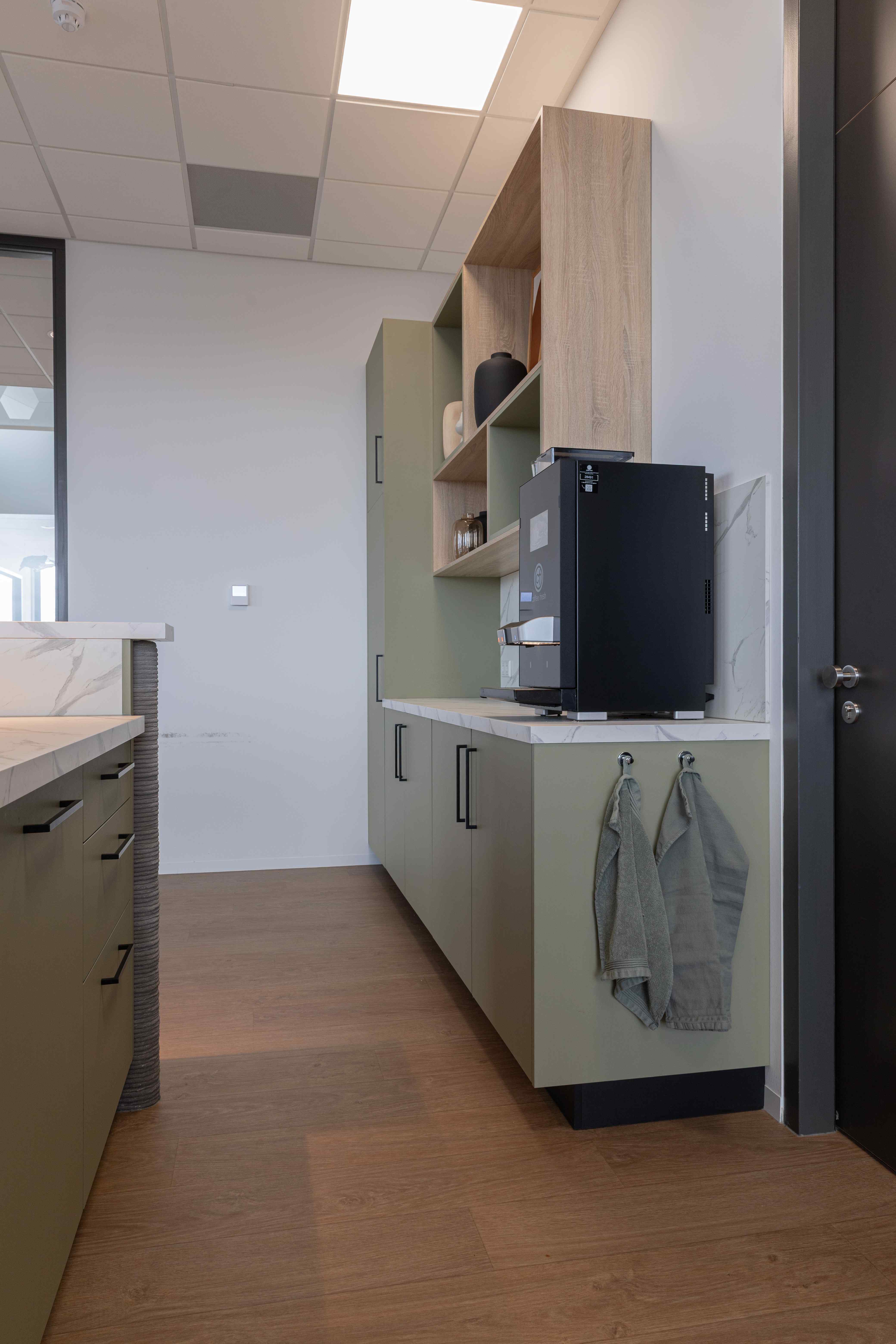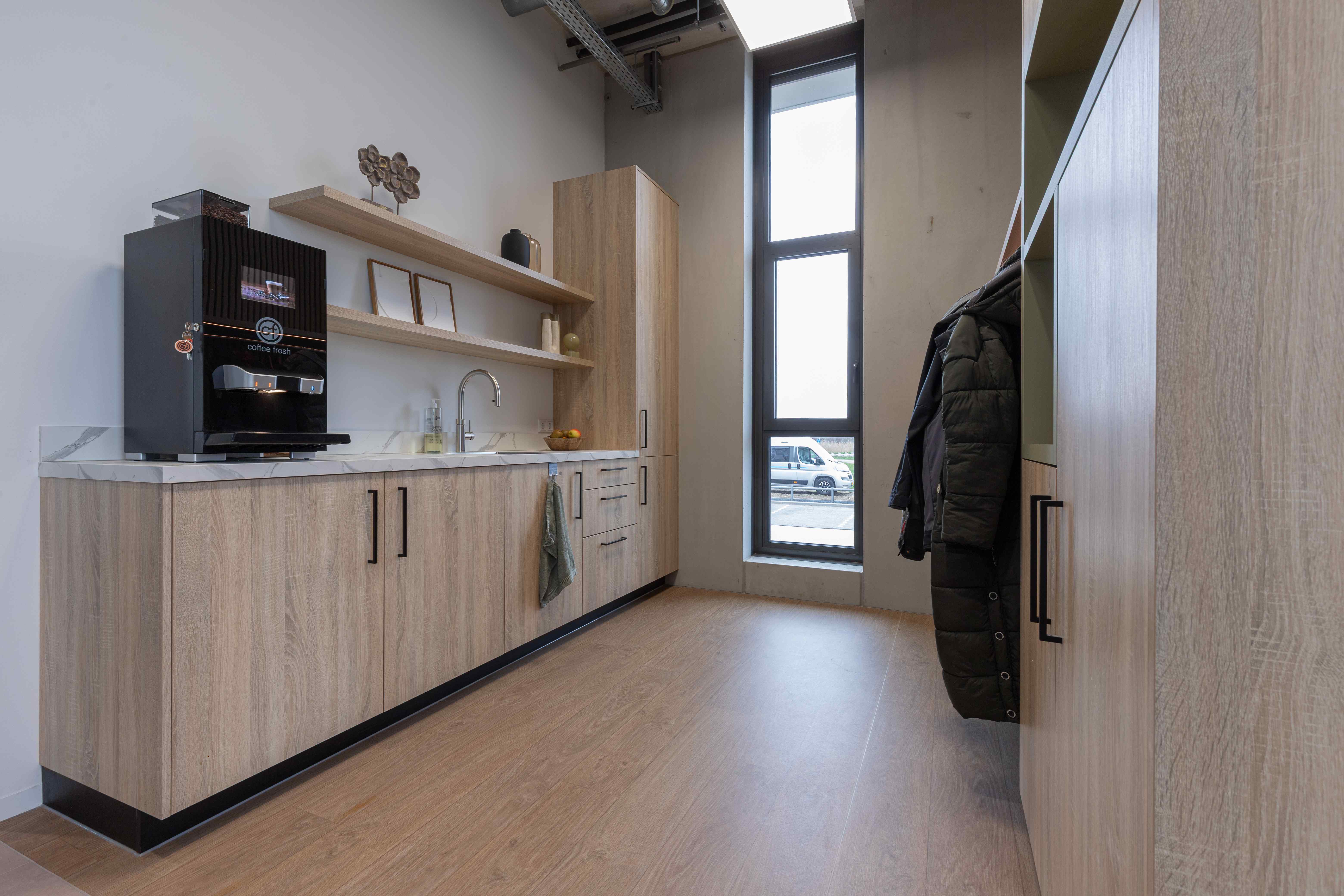Voor het nieuwe pand van Mombarg Beton realiseerden wij een compleet maatwerk interieur. In de kantine plaatsten we een baropstelling met bijpassende achterkast, ontworpen met oog voor detail en functionaliteit. Het resultaat is een warme, uitnodigende ruimte waar medewerkers en bezoekers zich direct thuis voelen. De karakteristieke betonafwerking rondom de bar, verzorgd door Mombarg zelf, sluit perfect aan bij hun eigen vakmanschap en geeft de ruimte een stoer en eigen gezicht. Daarnaast verzorgden we ook de pantryopstelling en een garderobe, evenals de sfeervolle zithoek bij de entree. De ringverlichting die we toepasten in het ontwerp draagt bij aan de eigentijdse en open uitstraling van het interieur. Een totaalplaatje waarin functionaliteit, sfeer en maatwerk naadloos samenkomen.
